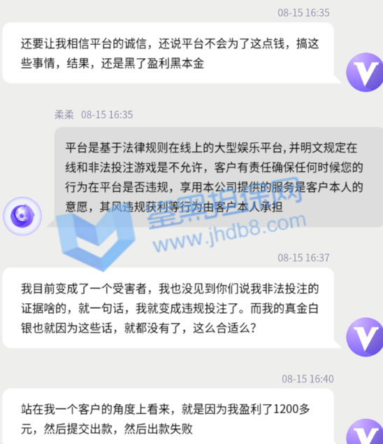 我是2021年8月10日注册的,到8月15日是第5天了,今天15:05分存款了15000元,玩彩票极速11选5,玩了一会,盈利了1240元,本着见好久收,然后就选择提款了,提款时间是15:20分,结果一直是审核中,过了有1个小时吧,提款失败了。于是便去问客服,客服说由于目前国际网络波动导致系统出款失败,请我重新提交提款,于是我便看了钱包,余额变0了,锁定钱包是16240元,于是便又问客服,客服又说系统大数据检测到了存在违规投注异常行为,违反了娱乐规则,将会冻结账号,无法再次登录娱乐。于是我便和客服说,不存在非法投注的情况啊,我昨天前天大前天都是这么玩的啊。于是客服说正在为我提交本金,然后让我进行提款,然后我又返回钱包看,余额还是0元,锁定钱包变成了1240元,等于我15000的本金存粹没有了。便又问客服去了,客服说系统自动例行检测我存在违规行为,且情节较为严重,已经扣除红利,并冻结账号,无法登录娱乐。然后说由于各部门分工不同,在线客服无法干涉到其他部门的工作程序,客服仅负责告知。然后我又问客服,客服翻来覆去就是那么几句话,说我非法投注,违规投注,违规获利,严重违反平台游戏规则损害平台利益,按照平台规则给予相关处理,以客服告知我的结果为准。反正就是不给出款,盈利不给,本金也不给。我多次和客服说,没有违规啥的,也不理,最后干脆对我爱理不理了。